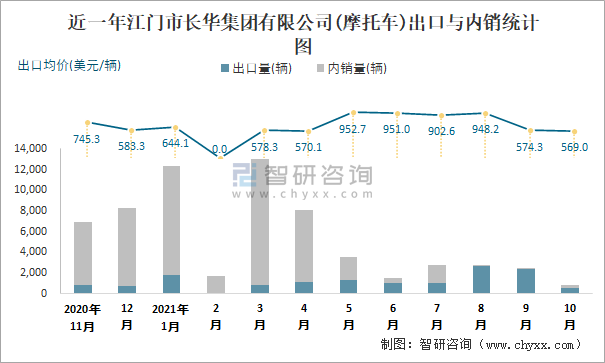 根據中國汽車工業(摩托車)產銷快訊數據統計可知:近一年江門市長華集團有限公司(摩托車)出口量偏少,銷量以內銷為主,總出口量占比總銷量的22.1%,出口均價8月起逐月遞減,其中10月出口量為580輛,出口均價約為568.97美元/輛;2021年1-10月江門市長華集團有限公司(摩托車)累計出口量為12645輛,同比下降20%,累計出口金額約為958萬美元,同比下降24.09%。