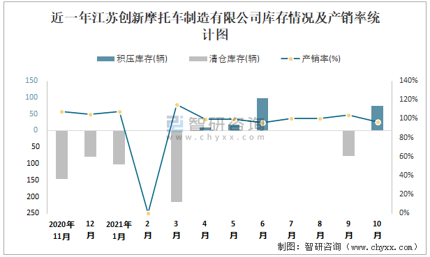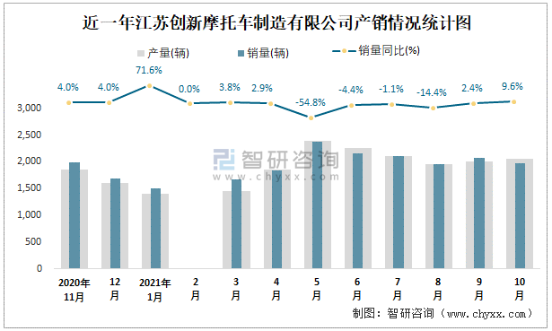 近一年江蘇創新摩托車制造有限公司產銷情況統計圖