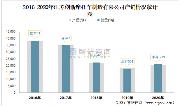 2016-2020年江蘇創新摩托車制造有限公司產銷情況統計圖