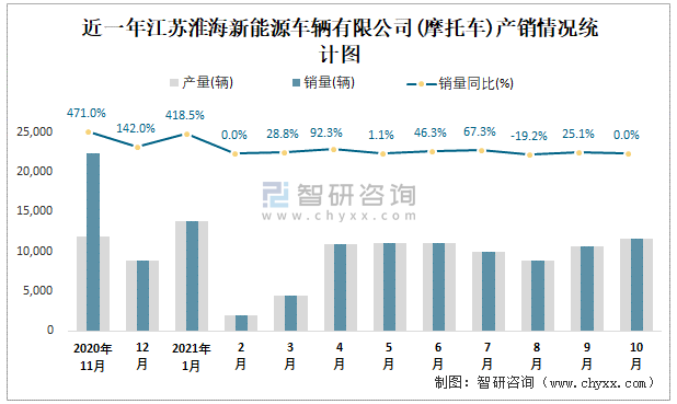 根據(jù)中國汽車工業(yè)(摩托車)產(chǎn)銷快訊數(shù)據(jù)顯示:2021年10月江蘇淮海新能源車輛有限公司(摩托車)產(chǎn)量為11583輛,同比增長10.3%,銷量為11583輛,同比下降0%;2021年1-10月江蘇淮海新能源車輛有限公司(摩托車)累計產(chǎn)量為94530輛,同比增長53.98%,累計銷量為94530輛,同比增長85.76%;2019-2020年江蘇淮海新能源車輛有限公司(摩托車)產(chǎn)銷量有所增加,且近2年總銷量大于總產(chǎn)量,清倉庫存150輛,暫未出口,全部依靠內(nèi)銷。