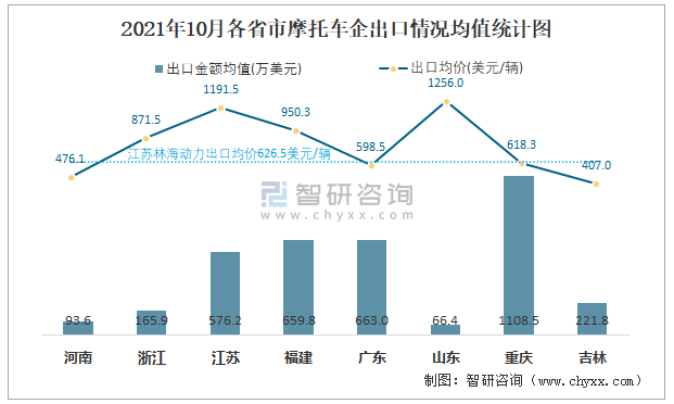 2021年10月各省市摩托車企出口情況均值統(tǒng)計(jì)圖