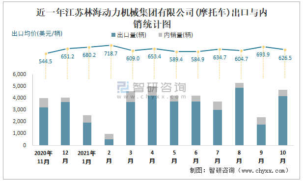 根據(jù)中國汽車工業(yè)(摩托車)產(chǎn)銷快訊數(shù)據(jù)統(tǒng)計(jì)可知:近一年江蘇林海動力機(jī)械集團(tuán)有限公司(摩托車)共積壓庫存2376輛,其產(chǎn)銷率存在一定幅度波動,2020年12月產(chǎn)銷率最高(143.16%),清倉庫存1214輛,9月產(chǎn)銷率偏低(53.52%),積壓庫存2058輛;近一年江蘇林海動力機(jī)械集團(tuán)有限公司(摩托車)總體銷量以出口為主,總出口量占比總銷量的84.1%,出口均價(jià)2月達(dá)到最高值,此后總體呈現(xiàn)下降趨勢,其中10月出口量為4189輛,出口均價(jià)約為626.5美元/輛;2021年1-10月江蘇林海動力機(jī)械集團(tuán)有限公司(摩托車)累計(jì)出口量為31518輛,同比增長33.61%,累計(jì)出口金額約為1968.87萬美元,同比增長58.13%。