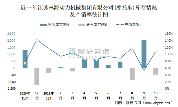 近一年江蘇林海動力機(jī)械集團(tuán)有限公司庫存情況及產(chǎn)銷率統(tǒng)計(jì)圖