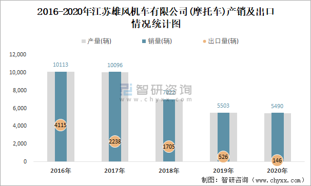 2016-2020年江蘇雄風機車有限公司產銷及出口情況統計圖