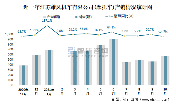 近一年江蘇雄風機車有限公司產銷情況統計圖