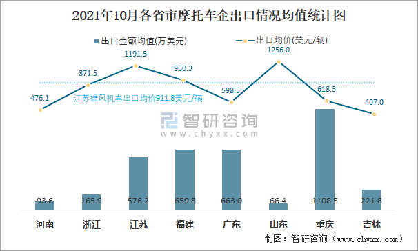 根據中國汽車工業(摩托車)產銷快訊與企查查數據統計可知:2021年10月92家車企摩托車銷量為1657429輛,出口總金額約為50967.89萬美元(其中有兩家子公司,其數據已包含在母公司中,不參加行業匯總);2021年10月92家車企擁有20年以上企業年齡的銷量最高,從企業資本性質來看,銷量占比最大的為內資企業(部分上市公司股份不明確的企業未統計在內),從企業人員規模來看,擁有1000-9999人員規模的車企銷量占比最大,非上市公司銷量占比最高。92家車企主要分布在10個省(市),其中廣東車企最多(26個),部分省市車企不出口,從出口金額均值來看,重慶車企(18家企業)出口金額均值最高,江蘇雄風機車有限公司約為911.8美元/輛,低于江蘇出口均價。