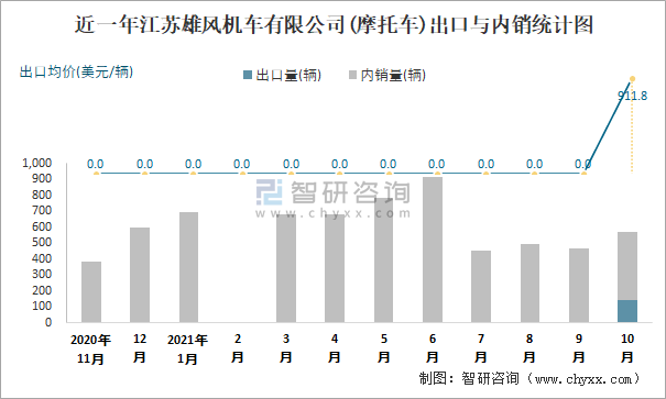 根據中國汽車工業(摩托車)產銷快訊數據統計可知:近一年江蘇雄風機車有限公司(摩托車)出口量偏少,銷量以內銷為主,總出口量占比總銷量的2.1%,出口均價10月達到最高值,其中10月出口量為144輛,出口均價約為911.81美元/輛;2021年1-10月江蘇雄風機車有限公司(摩托車)累計出口量為144輛,同比下降1.37%,累計出口金額約為13.13萬美元,同比增長41.64%。