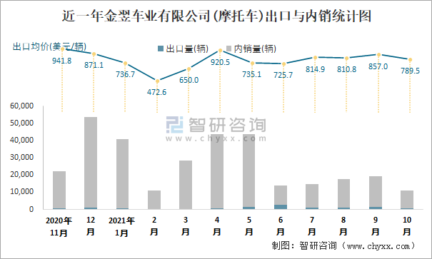 根據中國汽車工業(摩托車)產銷快訊數據統計可知:近一年金翌車業有限公司(摩托車)共清倉庫存43輛,其產銷率存在一定幅度波動,2月產銷率最高(104.62%),清倉庫存484輛,2020年12月產銷率偏低(98.72%),積壓庫存695輛;近一年金翌車業有限公司(摩托車)出口量偏少,銷量以內銷為主,總出口量占比總銷量的3.5%,出口均價2月跌至最低值,此后總體呈現上升趨勢,其中10月出口量為769輛,出口均價約為789.47美元/輛;2021年1-10月金翌車業有限公司(摩托車)累計出口量為9710輛,同比增長88.4%,累計出口金額約為744.31萬美元,同比增長52.84%。