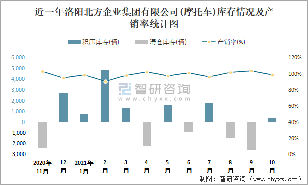 近一年洛陽北方企業集團有限公司庫存情況及產銷率統計圖