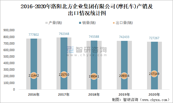 根據中國汽車工業(摩托車)產銷快訊數據顯示:2021年10月洛陽北方企業集團有限公司(摩托車)產量為50310輛,同比下降19.86%,銷量為49927輛,同比下降18.24%;2021年1-10月洛陽北方企業集團有限公司(摩托車)累計產量為636872輛,同比增長5.68%,累計銷量為633195輛,同比增長5.48%;2016-2020年洛陽北方企業集團有限公司(摩托車)產銷量相對平穩,漲跌幅度相對較小,且近5年總銷量大于總產量,清倉庫存3128輛,出口量偏少,銷量以內銷為主。