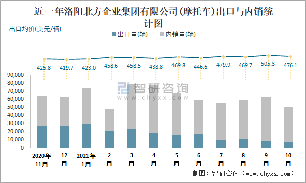 根據中國汽車工業(摩托車)產銷快訊數據統計可知:近一年洛陽北方企業集團有限公司(摩托車)共積壓庫存4067輛,其產銷率存在一定幅度波動,9月產銷率最高(104.27%),清倉庫存2551輛,2月產銷率偏低(90.84%),積壓庫存4860輛;近一年洛陽北方企業集團有限公司(摩托車)出口量偏少,銷量以內銷為主,總出口量占比總銷量的29%,出口均價9月達到最高值,此后有所下滑,其中10月出口量為7866輛,出口均價約為476.1美元/輛;2021年1-10月洛陽北方企業集團有限公司(摩托車)累計出口量為165581輛,同比下降9.19%,累計出口金額約為7535.44萬美元,同比增長2.54%。