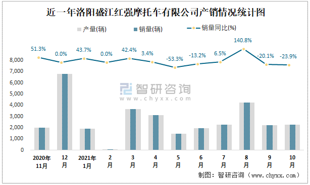 近一年洛陽盛江紅強摩托車有限公司產銷情況統計圖