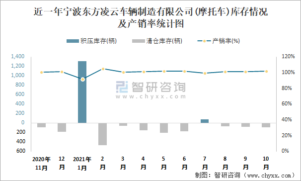近一年寧波東方凌云車輛制造有限公司庫存情況及產銷率統計圖