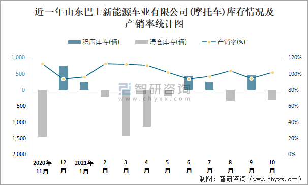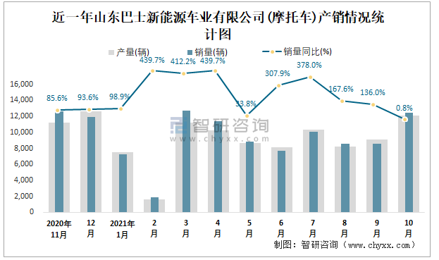 根據(jù)中國(guó)汽車工業(yè)(摩托車)產(chǎn)銷快訊數(shù)據(jù)顯示:2021年10月山東巴士新能源車業(yè)有限公司(摩托車)產(chǎn)量為12098輛,同比增長(zhǎng)44.56%,銷量為12412輛,同比增長(zhǎng)0.79%;2021年1-10月山東巴士新能源車業(yè)有限公司(摩托車)累計(jì)產(chǎn)量為87145輛,同比增長(zhǎng)141.35%,累計(jì)銷量為89312輛,同比增長(zhǎng)162.03%;2019-2020年山東巴士新能源車業(yè)有限公司(摩托車)產(chǎn)銷量有所下滑,且近2年總產(chǎn)量大于總銷量,積壓了庫(kù)存5729輛,暫未出口,全部依靠?jī)?nèi)銷。