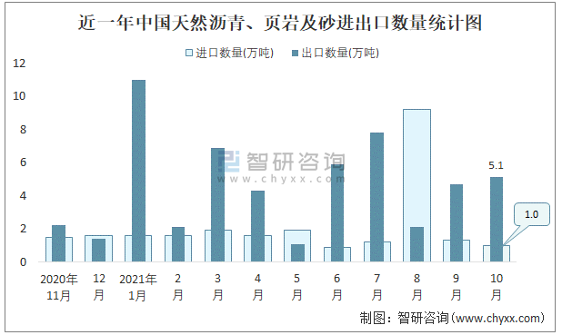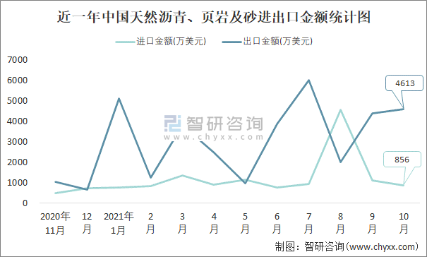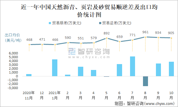 根據中國石油和化學工業聯合會數據顯示:2021年10月中國天然瀝青、頁巖及砂進口數量為1萬噸,出口數量為5.1萬噸;進口金額為856萬美元,出口金額為4613萬美元;近一年中國天然瀝青、頁巖及砂出口總金額大于進口總金額,貿易順差為主,出口均價905美元/噸。
