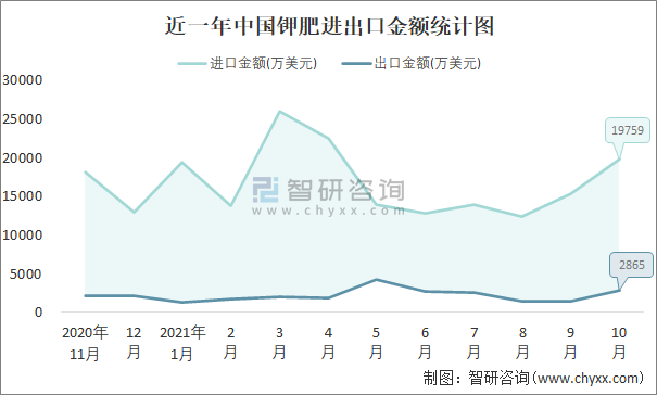 近一年中國鉀肥進出口金額統計圖