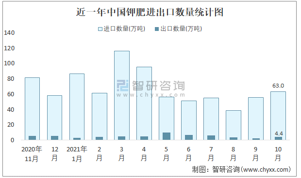 2021年10月中國鉀肥進出口數量分別為63萬噸和4.4萬噸