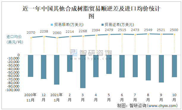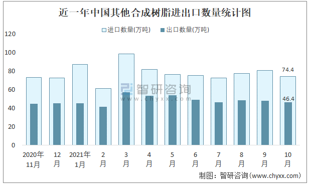 根據中國石油和化學工業聯合會數據顯示:2021年10月中國其他合成樹脂進口數量為74.4萬噸,出口數量為46.4萬噸;進口金額為186026萬美元,出口金額為122350萬美元;近一年中國其他合成樹脂出口總金額小于進口總金額,貿易逆差為主,進口均價2500美元/噸。