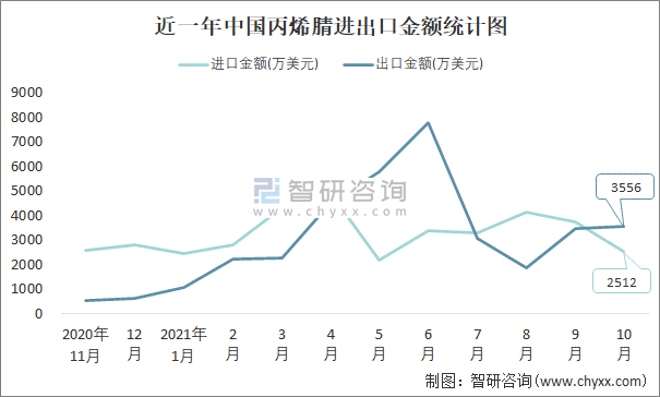 根據中國石油和化學工業聯合會數據顯示:2021年10月中國丙烯腈進口數量為1.2萬噸,出口數量為1.7萬噸;進口金額為2512萬美元,出口金額為3556萬美元;近一年中國丙烯腈出口總金額小于進口總金額,貿易逆差為主,進口均價2093美元/噸。