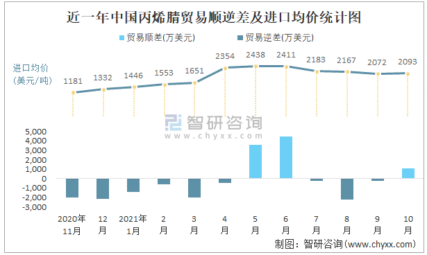 近一年中國丙烯腈順逆差及進口均價統計圖