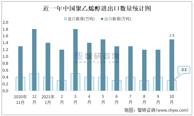 近一年中國聚乙烯醇進出口數(shù)量統(tǒng)計圖