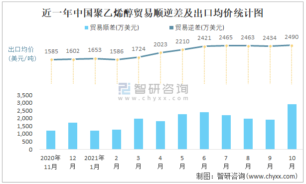 近一年中國聚乙烯醇順逆差及出口均價統(tǒng)計圖