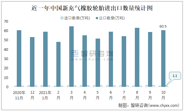 近一年中國(guó)新充氣橡膠輪胎進(jìn)出口數(shù)量統(tǒng)計(jì)圖