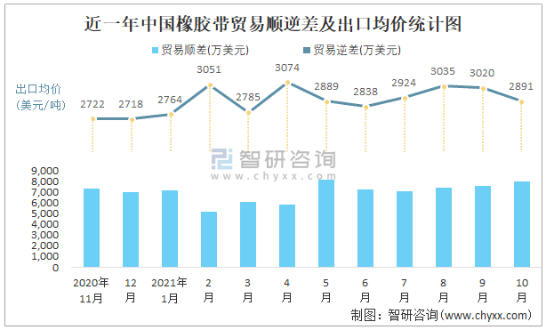 近一年中國橡膠帶順逆差及出口均價統計圖