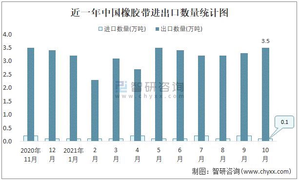 近一年中國橡膠帶進出口數量統計圖