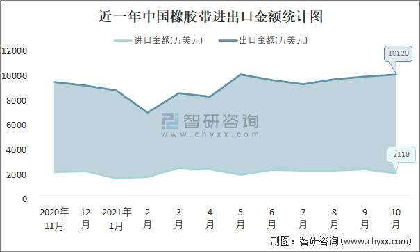 根據中國石油和化學工業聯合會數據顯示:2021年10月中國橡膠帶進口數量為0.1萬噸,出口數量為3.5萬噸;進口金額為2118萬美元,出口金額為10120萬美元;近一年中國橡膠帶出口總金額大于進口總金額,貿易順差為主,出口均價2891美元/噸。