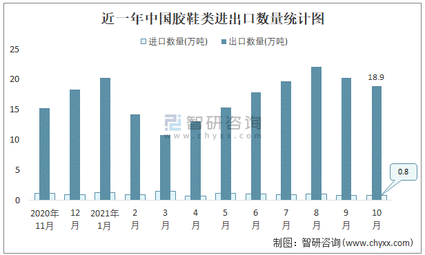 根據中國石油和化學工業聯合會數據顯示:2021年10月中國膠鞋類進口數量為0.8萬噸,出口數量為18.9萬噸;進口金額為36149萬美元,出口金額為252966萬美元;近一年中國膠鞋類出口總金額大于進口總金額,貿易順差為主,出口均價13384美元/噸。