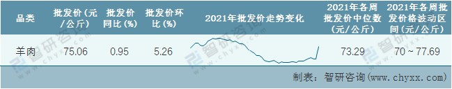 根據農村農業部數據統計可知:2021年第53周全國羊肉平均批發價為75.06元/公斤,同比增加0.95%,環比增加5.26%(第52周數據未公布,按第51周的數據統計),2021年羊肉價格下半年觸底反彈,天氣嚴寒促使羊肉消費需求增加,年底或將還有一波漲幅,2021年全國羊肉平均批發價最高達到77.69元/公斤,批發價最低也要70元/公斤。