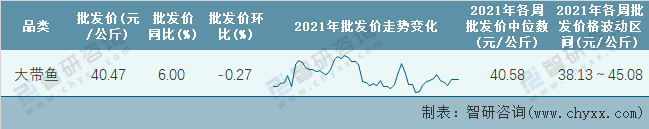 2021年第53周(12月20日-12月26日)全國大帶魚平均批發價分析:本周批發價為40.47元/公斤,同比增加6%