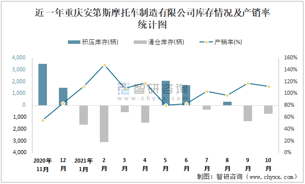 根據中國汽車工業(摩托車)產銷快訊數據統計可知:近一年重慶安第斯摩托車制造有限公司(摩托車)共清倉庫存123輛,其產銷率存在一定幅度波動,2月產銷率最高(148.28%),清倉庫存3090輛,2020年11月產銷率偏低(54.55%),積壓庫存3500輛;近一年重慶安第斯摩托車制造有限公司(摩托車)暫未出口,全部依靠內銷。