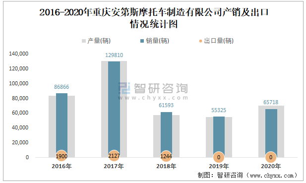 2016-2020年重慶安第斯摩托車制造有限公司產銷及出口情況統計圖