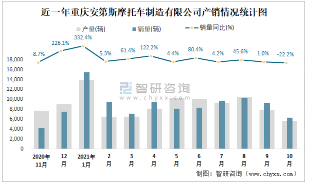 近一年重慶安第斯摩托車制造有限公司產銷情況統計圖