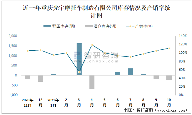 近一年重慶光宇摩托車制造有限公司庫存情況及產銷率統計圖