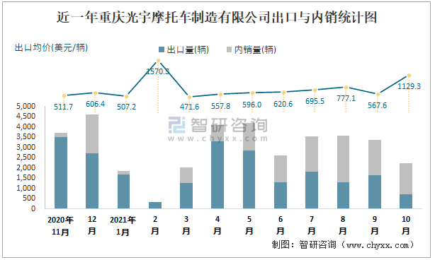 根據中國汽車工業(摩托車)產銷快訊數據統計可知:近一年重慶光宇摩托車制造有限公司(摩托車)共積壓庫存769輛,其產銷率存在一定幅度波動,4月產銷率最高(119.69%),清倉庫存674輛,3月產銷率偏低(55.45%),積壓庫存1636輛;近一年重慶光宇摩托車制造有限公司(摩托車)銷量以出口為主,總出口量占比總銷量的61.9%,出口均價3月跌至最低值,此后總體呈現上升趨勢,其中10月出口量為706輛,出口均價約為1129.32美元/輛;2021年1-10月重慶光宇摩托車制造有限公司(摩托車)累計出口量為16298輛,同比下降35.5%,累計出口金額約為1002.55萬美元,同比下降21.39%。
