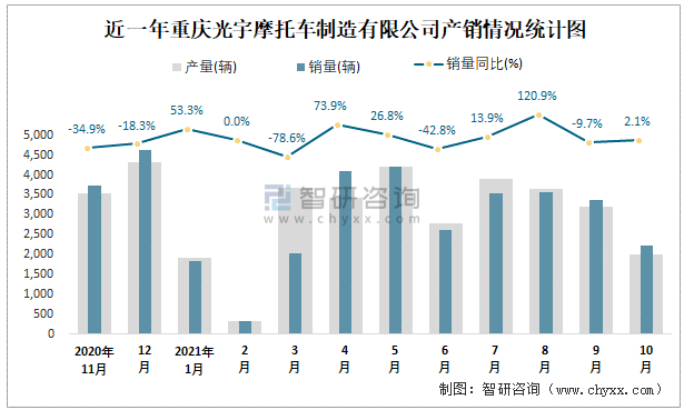 根據中國汽車工業(摩托車)產銷快訊數據顯示:2021年10月重慶光宇摩托車制造有限公司(摩托車)產量為1999輛,同比下降18.97%,銷量為2219輛,同比增長2.12%;2021年1-10月重慶光宇摩托車制造有限公司(摩托車)累計產量為30426輛,同比增長0.79%,累計銷量為29050輛,同比下降2.67%;2016-2020年重慶光宇摩托車制造有限公司(摩托車)產銷量逐年遞減,且近5年總銷量大于總產量,清倉庫存255輛,總體銷量以出口為主。