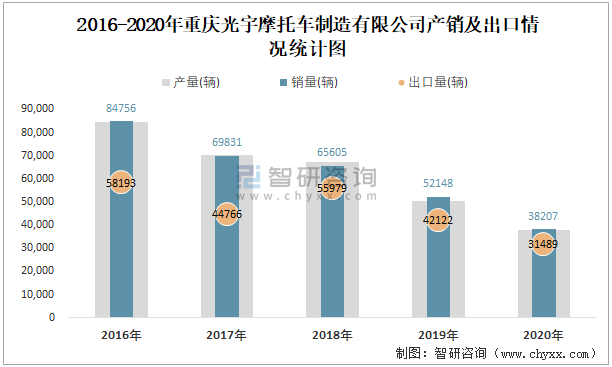 2016-2020年重慶光宇摩托車制造有限公司產銷及出口情況統計圖
