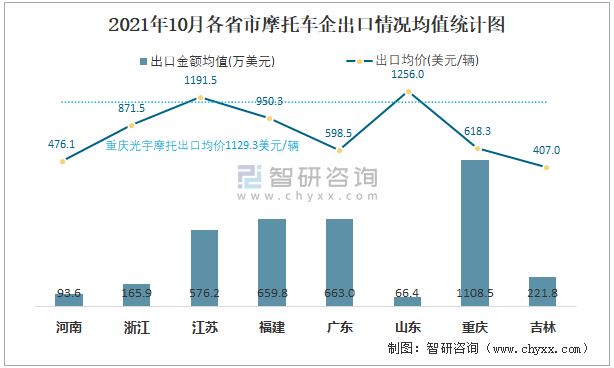 根據中國汽車工業(摩托車)產銷快訊與企查查數據統計可知:2021年10月92家車企摩托車銷量為1657429輛,出口總金額約為50967.89萬美元(其中有兩家子公司,其數據已包含在母公司中,不參加行業匯總);2021年10月92家車企擁有20年以上企業年齡的銷量最高,從企業資本性質來看,銷量占比最大的為內資企業(部分上市公司股份不明確的企業未統計在內),從企業人員規模來看,擁有1000-9999人員規模的車企銷量占比最大,非上市公司銷量占比最高。92家車企主要分布在10個省(市),其中廣東車企最多(26個),部分省市車企不出口,從出口金額均值來看,重慶車企(18家企業)出口金額均值最高,重慶光宇摩托車制造有限公司約為1129.3美元/輛,高于重慶出口均價。