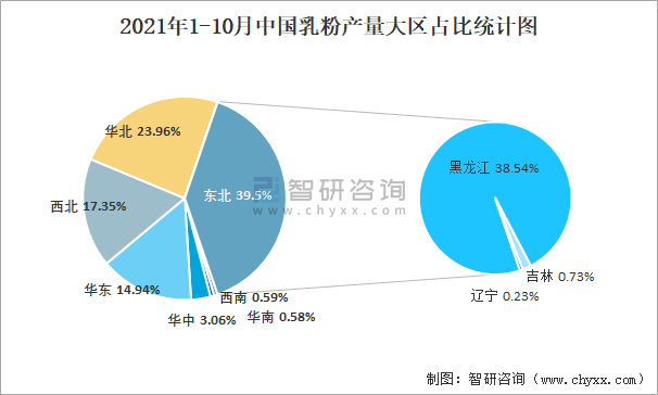 2021年1-10月中國乳粉產量大區占比統計圖