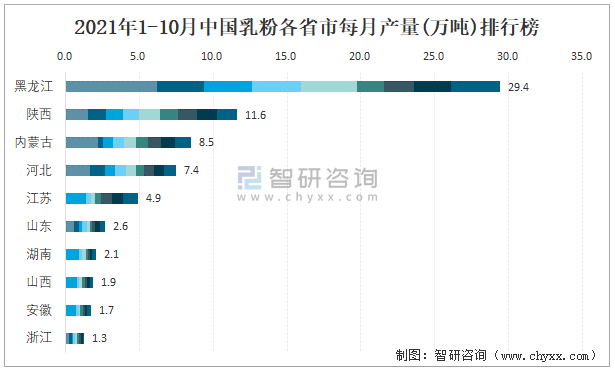 2021年1-10月中國乳粉各省市每月產量排行榜