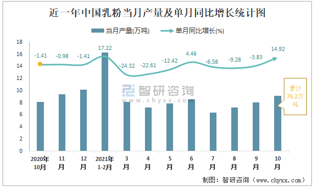 近一年中國乳粉當月產量及單月同比增長統計圖