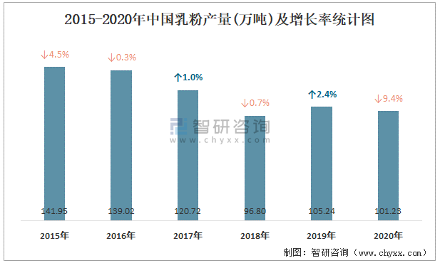 2015-2020年中國乳粉產量及增長率統計圖
