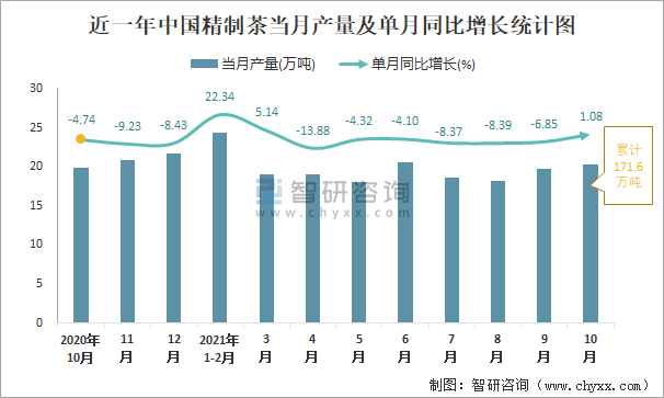 近一年中國(guó)精制茶當(dāng)月產(chǎn)量及單月同比增長(zhǎng)統(tǒng)計(jì)圖
