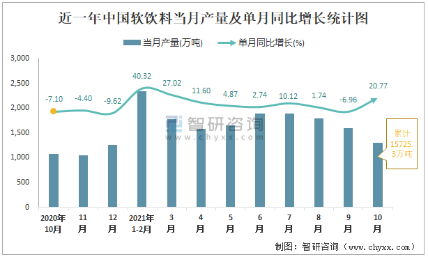 根據(jù)國家統(tǒng)計局數(shù)據(jù)顯示:2021年10月中國軟飲料產量為1294萬噸,同比增長20.77%;2021年1-10月中國軟飲料累計產量為15725.3萬噸,同比增長12.17%;2015-2020年中國軟飲料產量2018年跌至最低,次年大幅度上升。