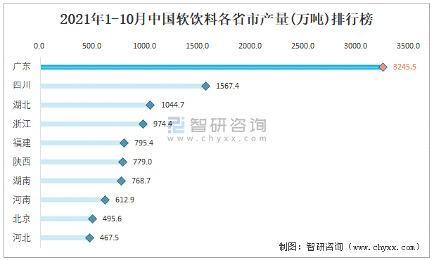 根據(jù)國家統(tǒng)計局數(shù)據(jù)顯示:2021年各季度中國軟飲料主要集中在華南、華東、西南地區(qū)生產;2021年1-10月中國軟飲料產量大區(qū)分布相對均衡,其中華南地區(qū)產量最高,特別是廣東省貢獻了最多產量;2021年1-10月中國軟飲料各省產量top1遙遙領先于其他前9名。
