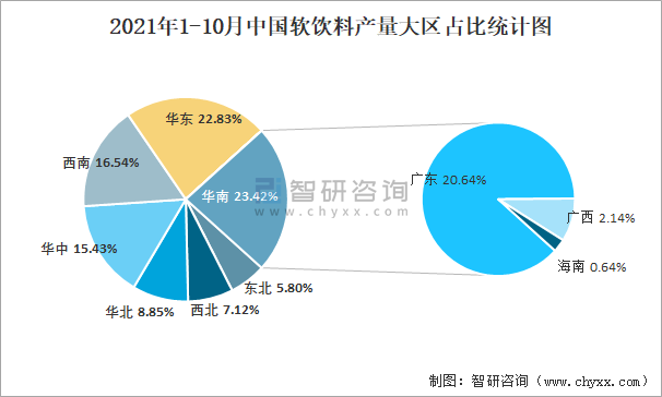 2021年1-10月中國軟飲料產量為15725.3萬噸 華南地區(qū)產量最高(占比23.42%)