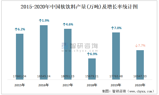 2015-2020年中國軟飲料產量及增長率統(tǒng)計圖